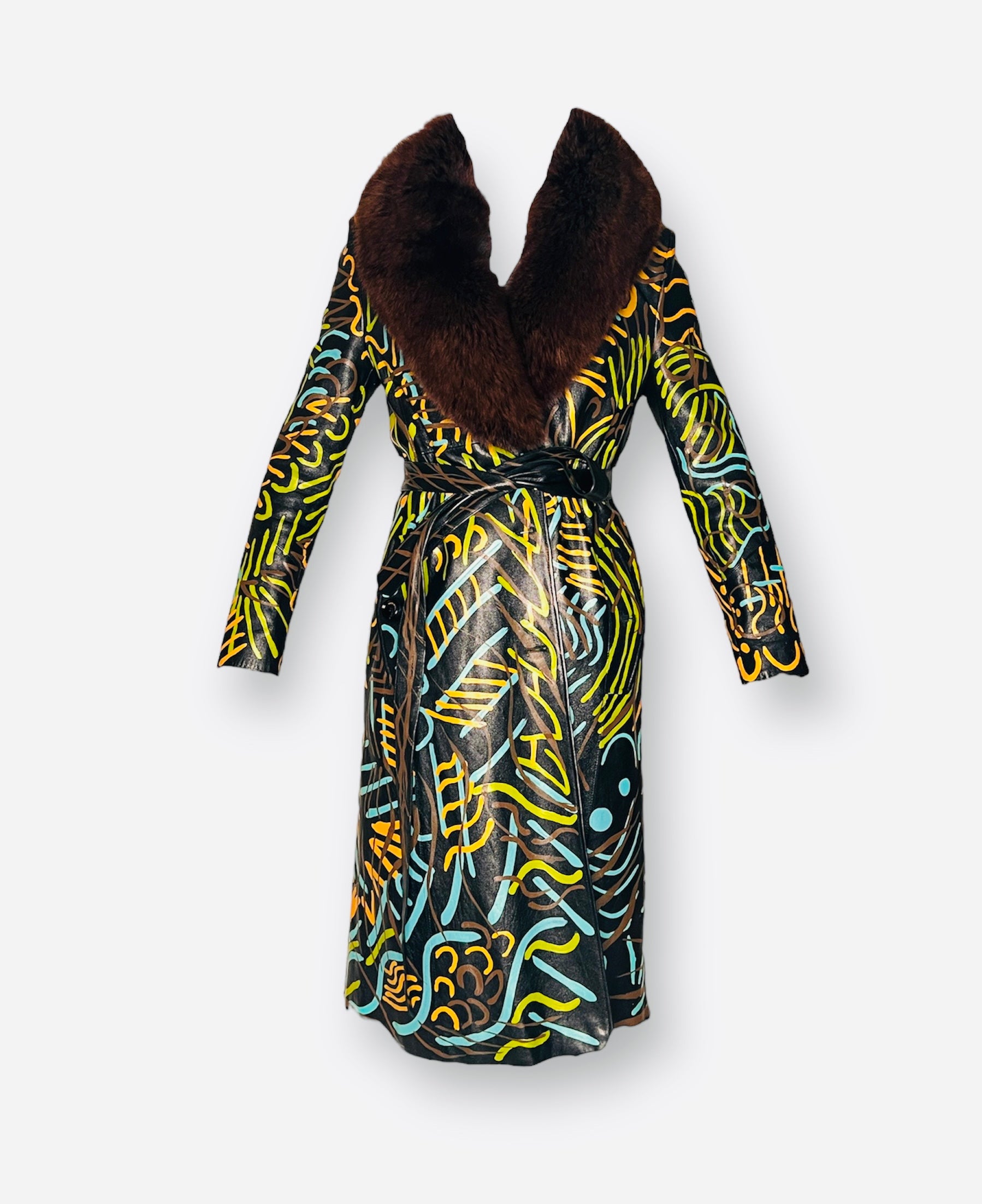 This is a vibrant and carefully hand-painted, one-of-a-kind ,luxury Leather jacket with a fur collar lining.